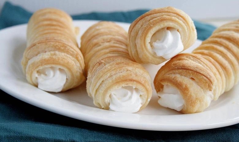 Cream horns are spiral-shaped pastries wrapped around metal molds, baked until golden and crisp, then filled with sweet cream or custard.